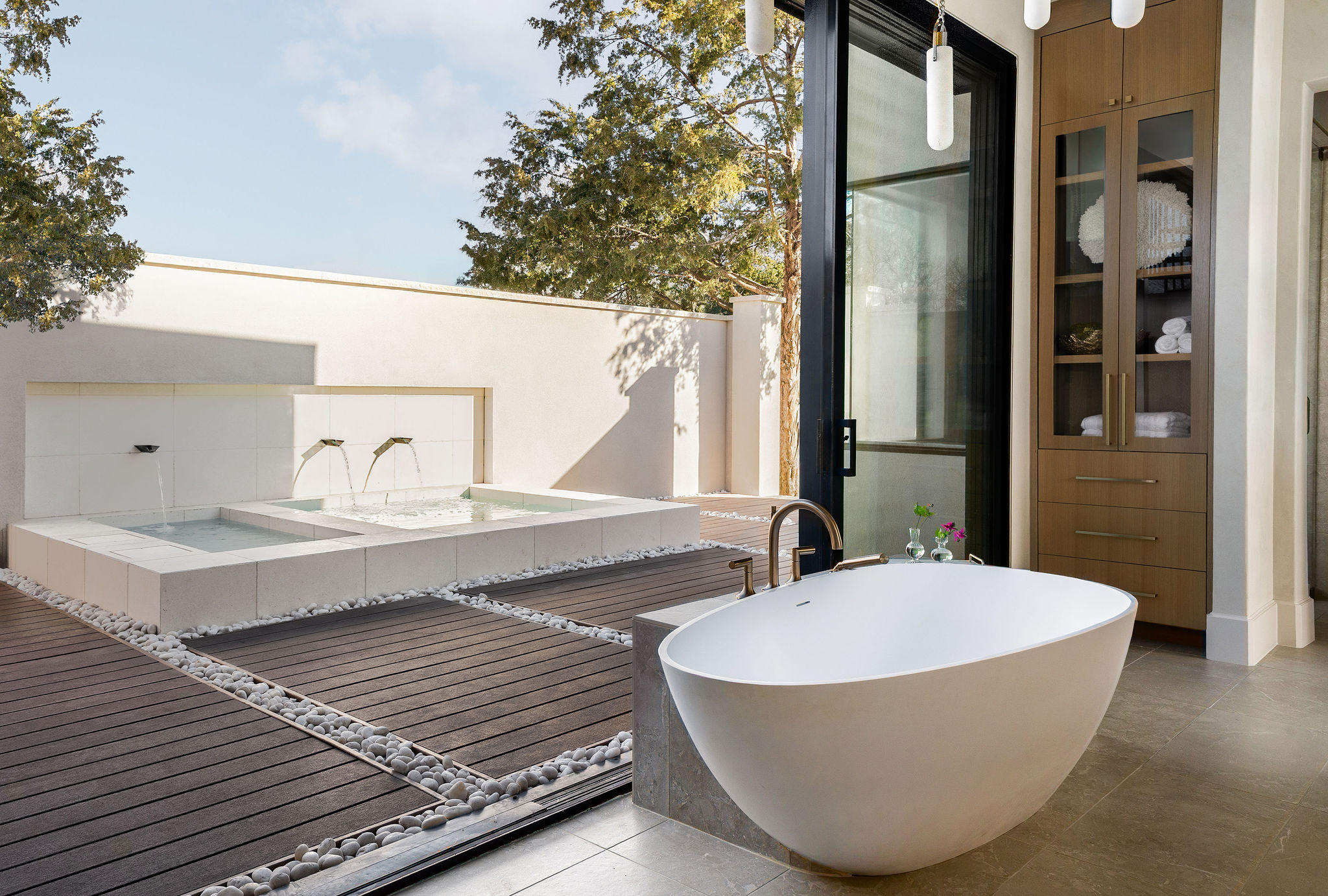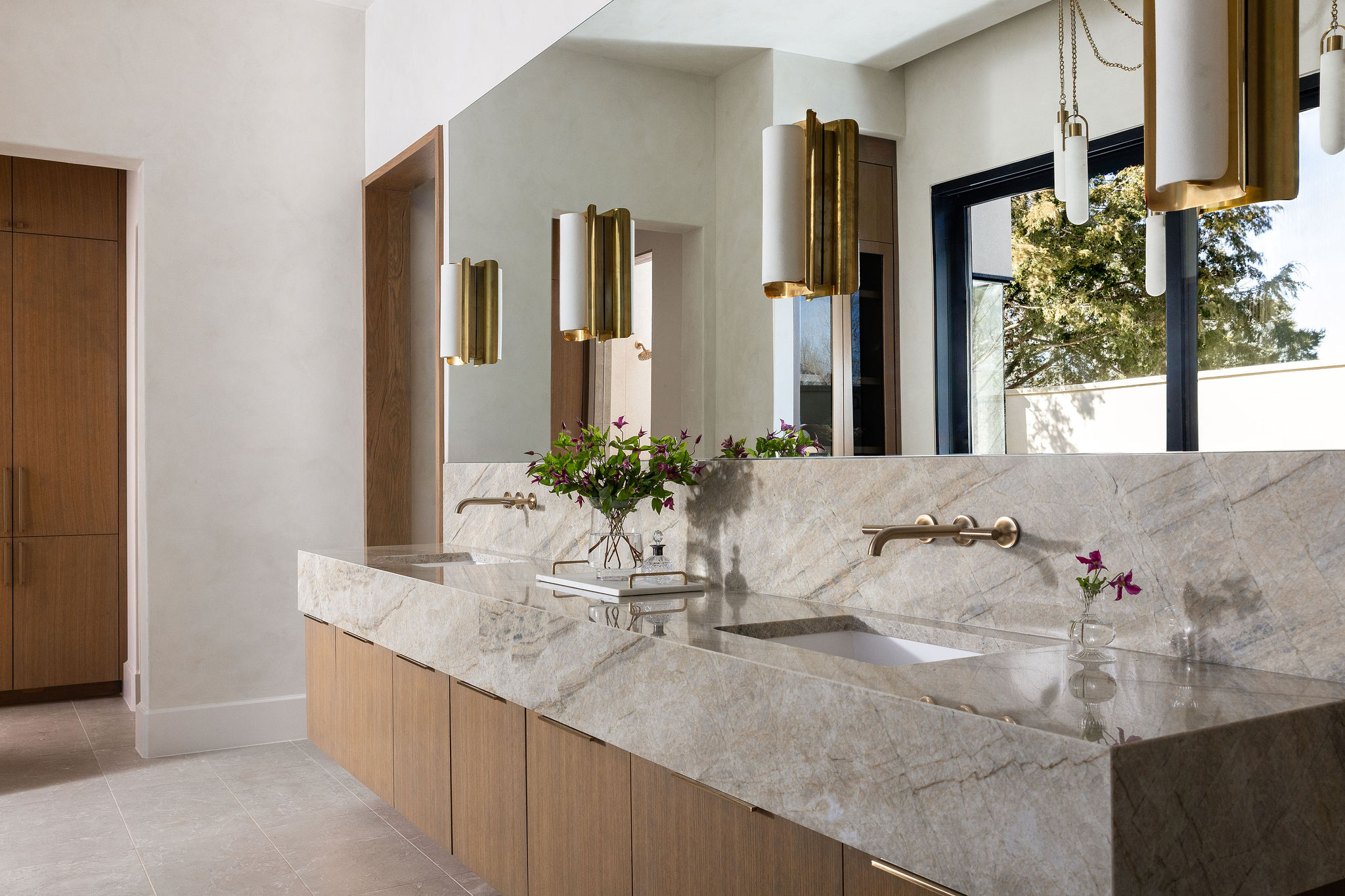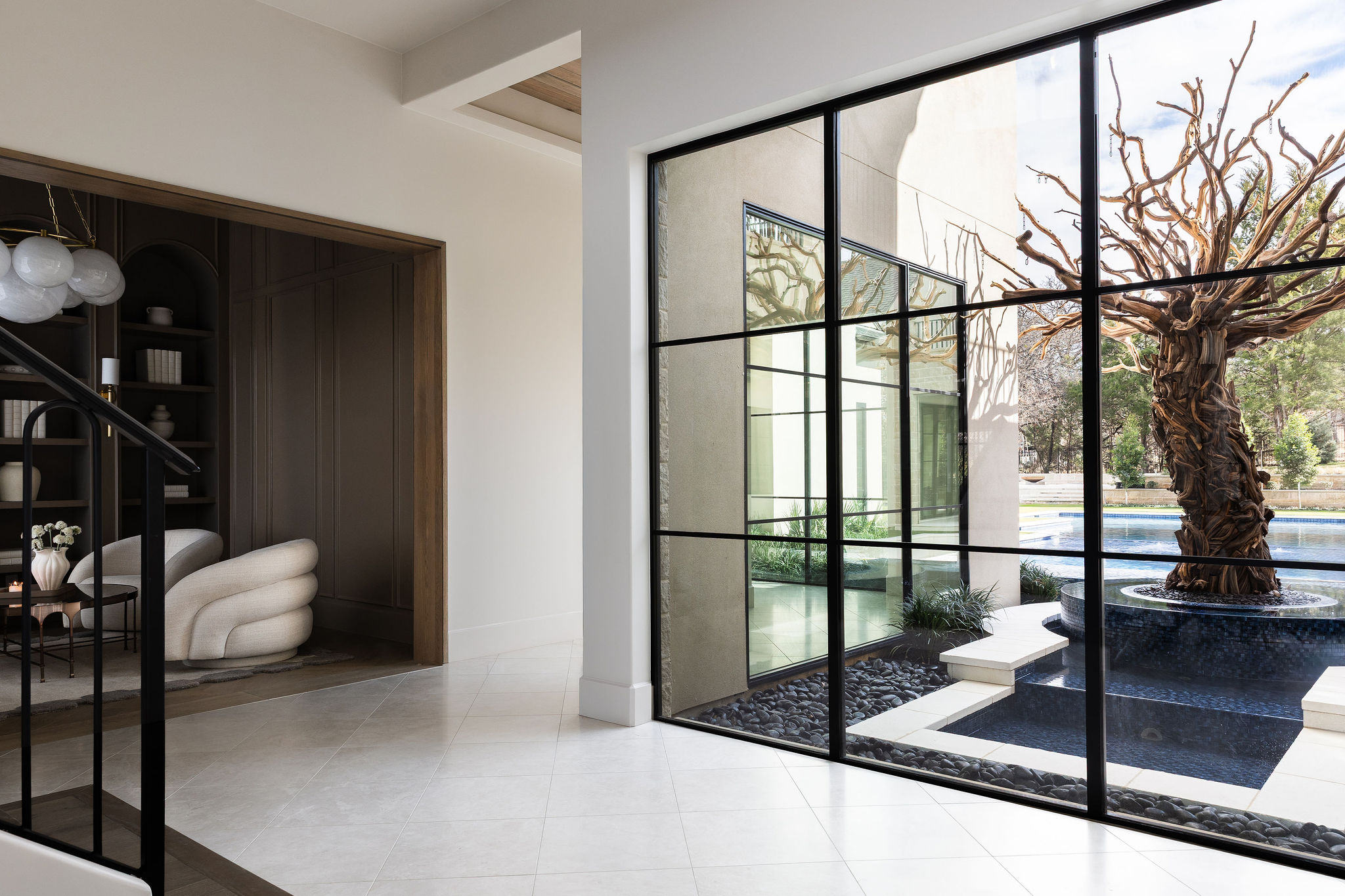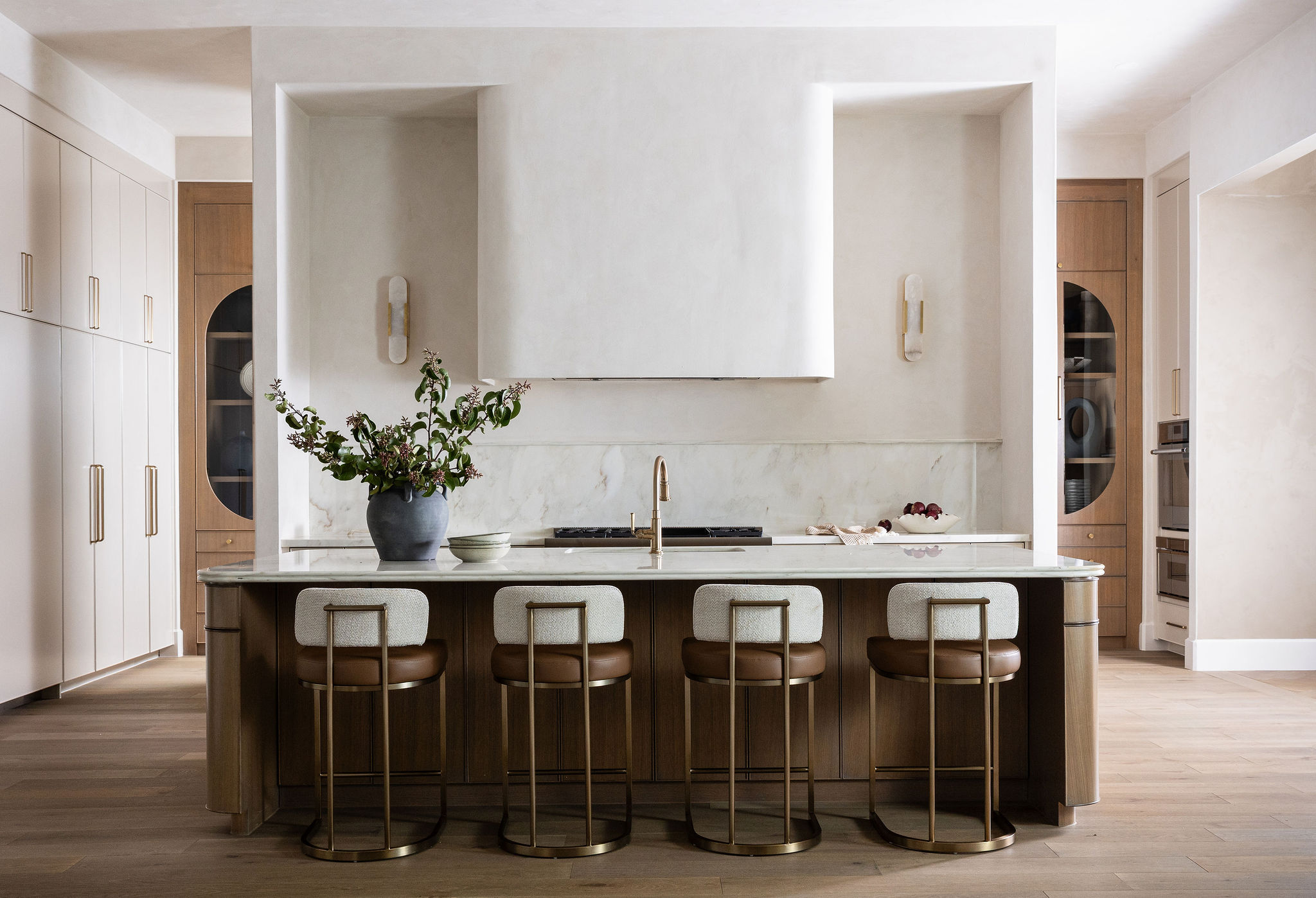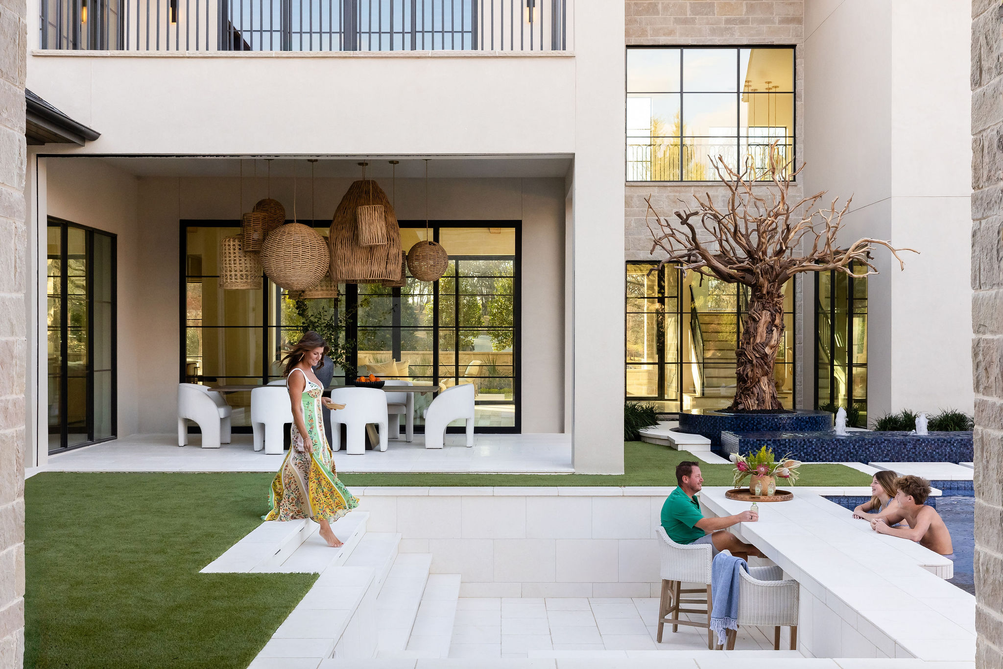 The design draws from the family's love of resort-style living and their travels to Mexico, resulting in a home that balances warmth with sophistication. Plaster walls and detailed ceilings run throughout the main living spaces. The primary bathroom opens through floor-to-ceiling glass sliders to a private outdoor cold plunge and hot tub. A moody home bar features custom millwork and dramatic stone countertops. The backyard is anchored by a sculptural tree sourced from Mexico and an outdoor dining space designed to feel like a private resort.