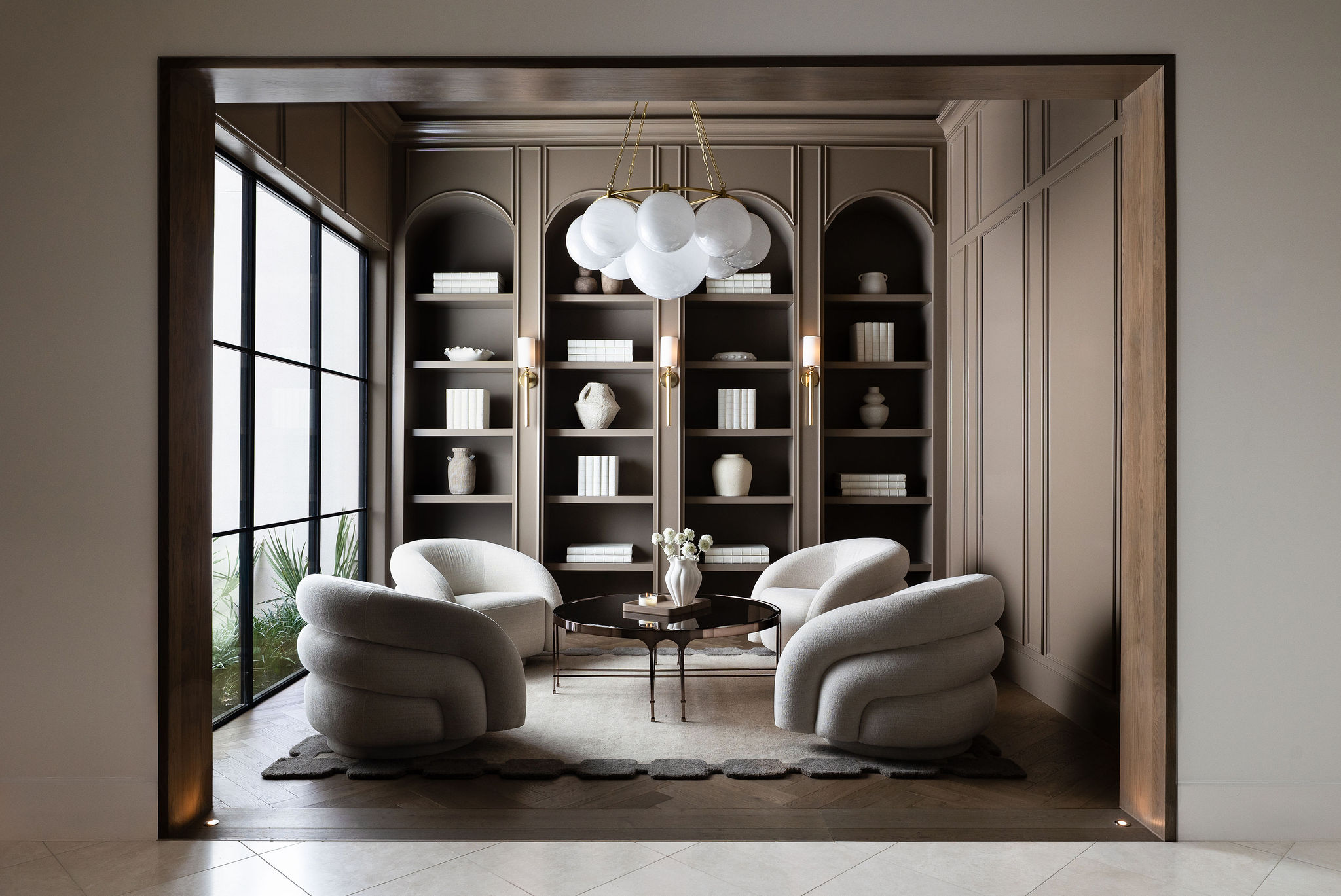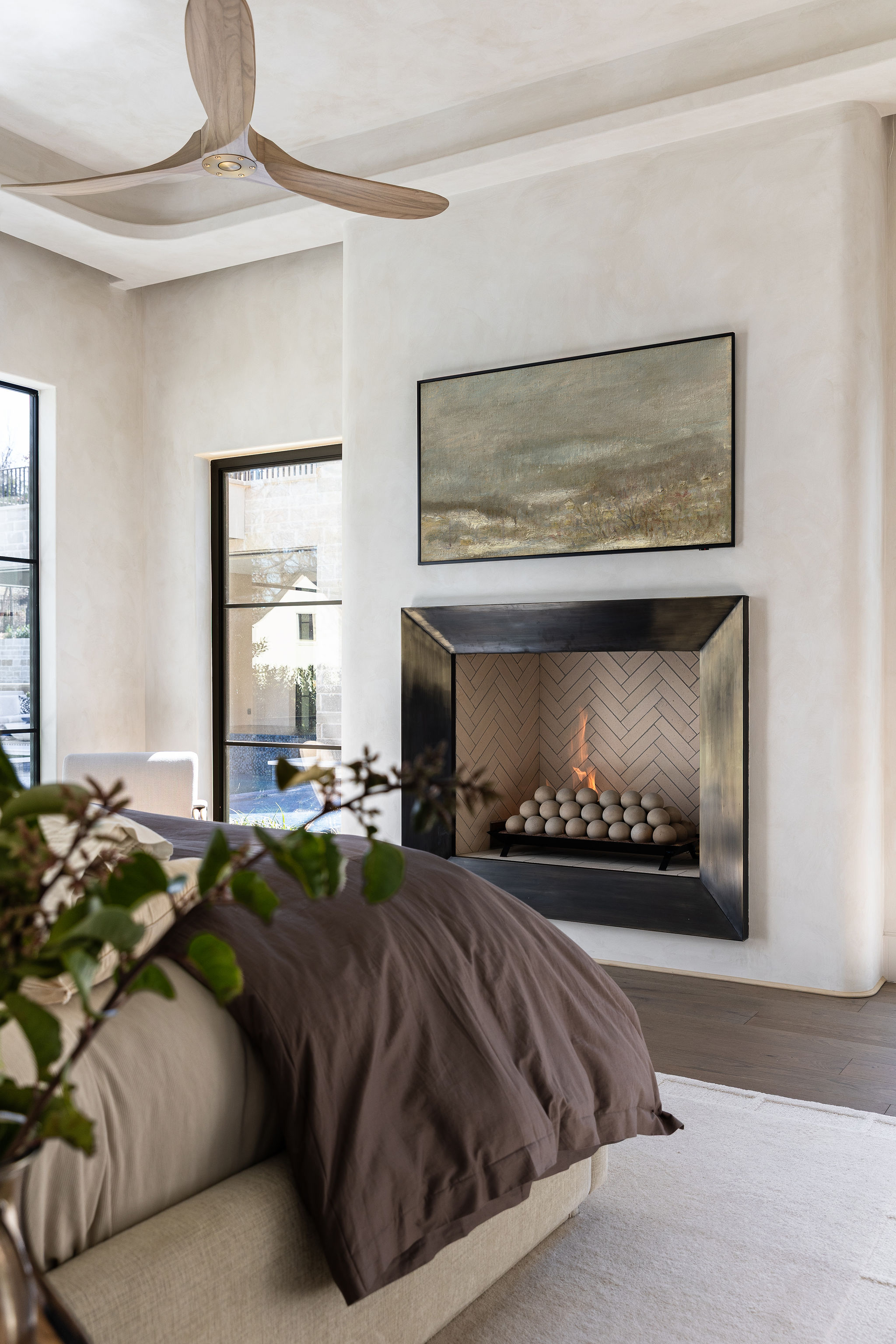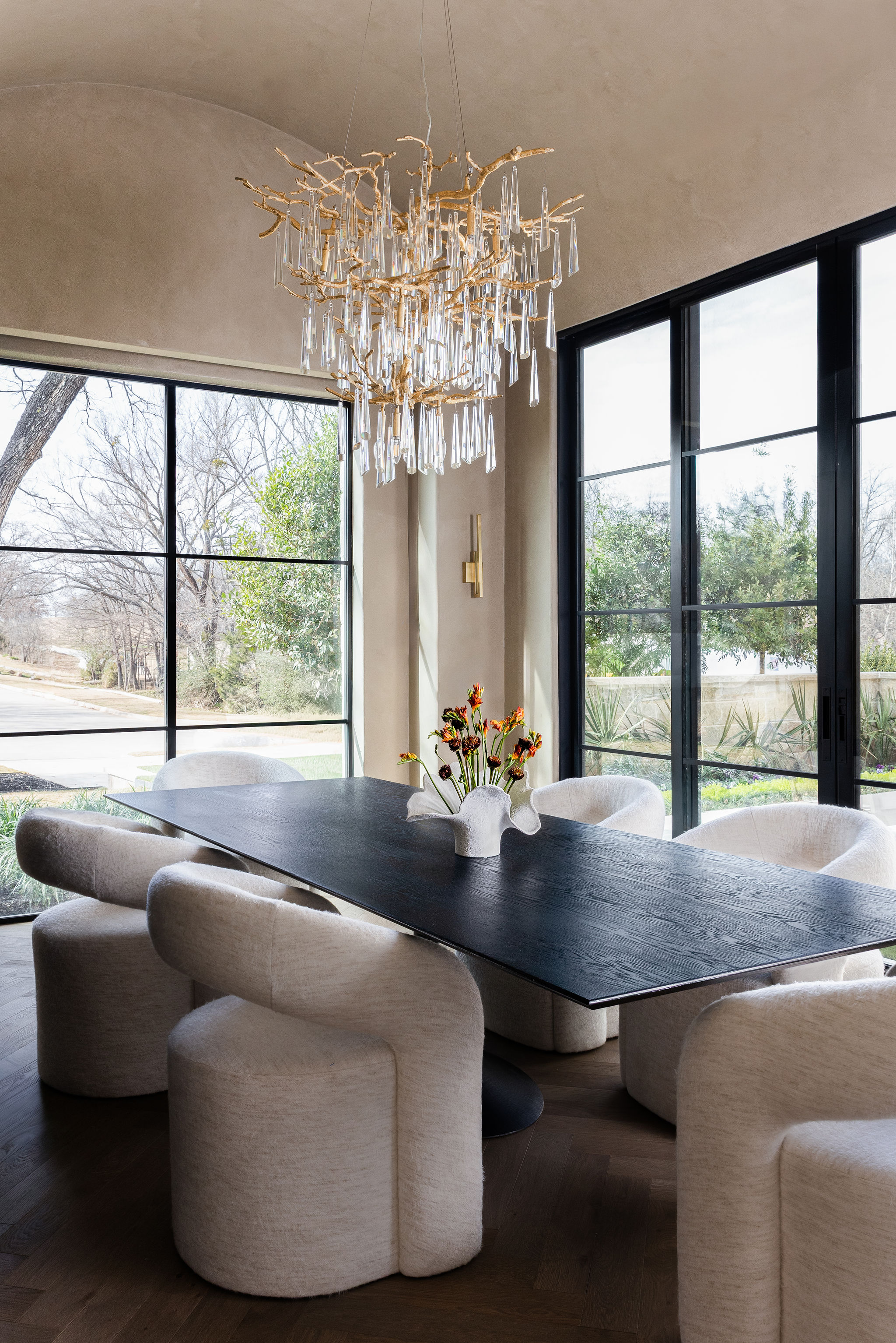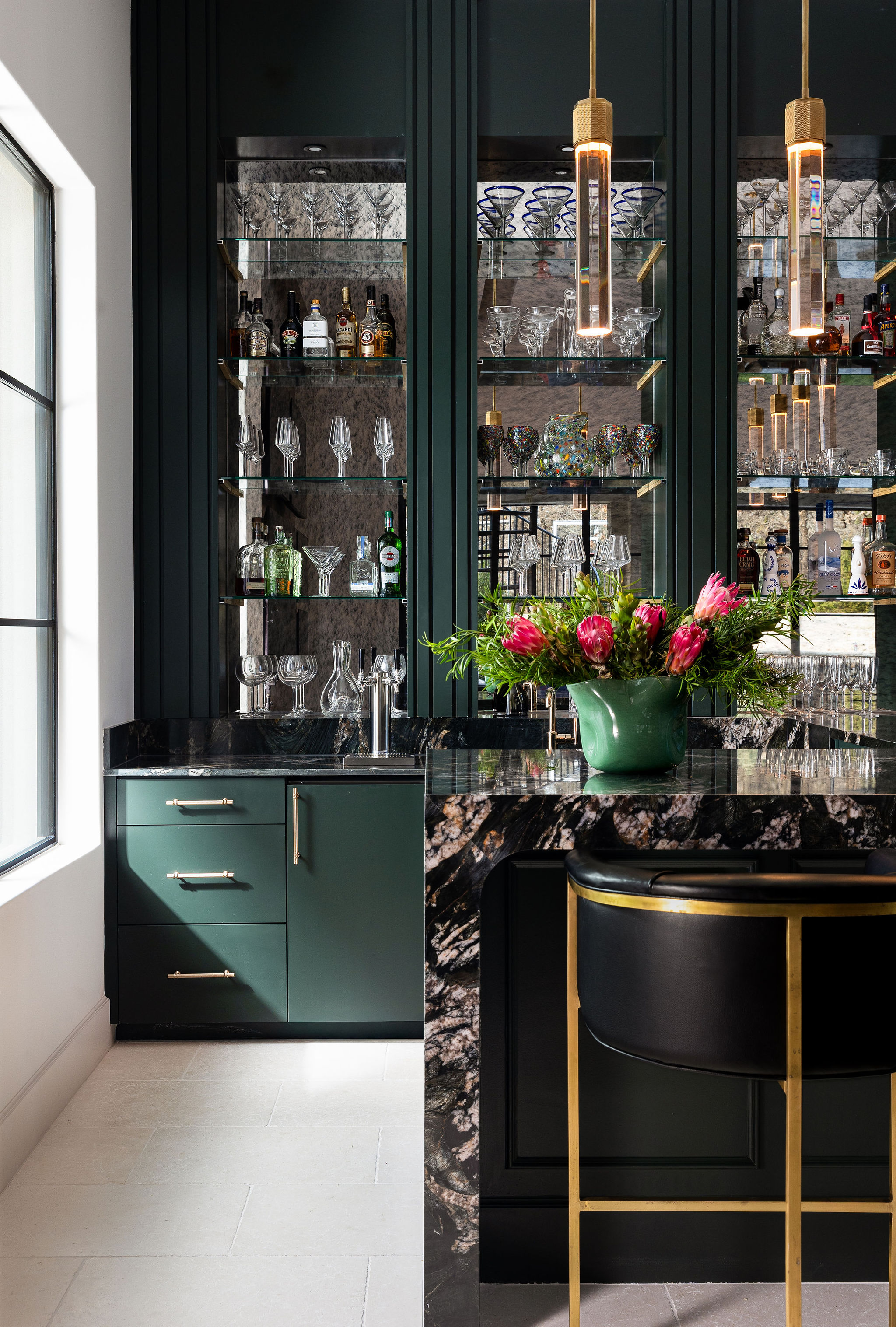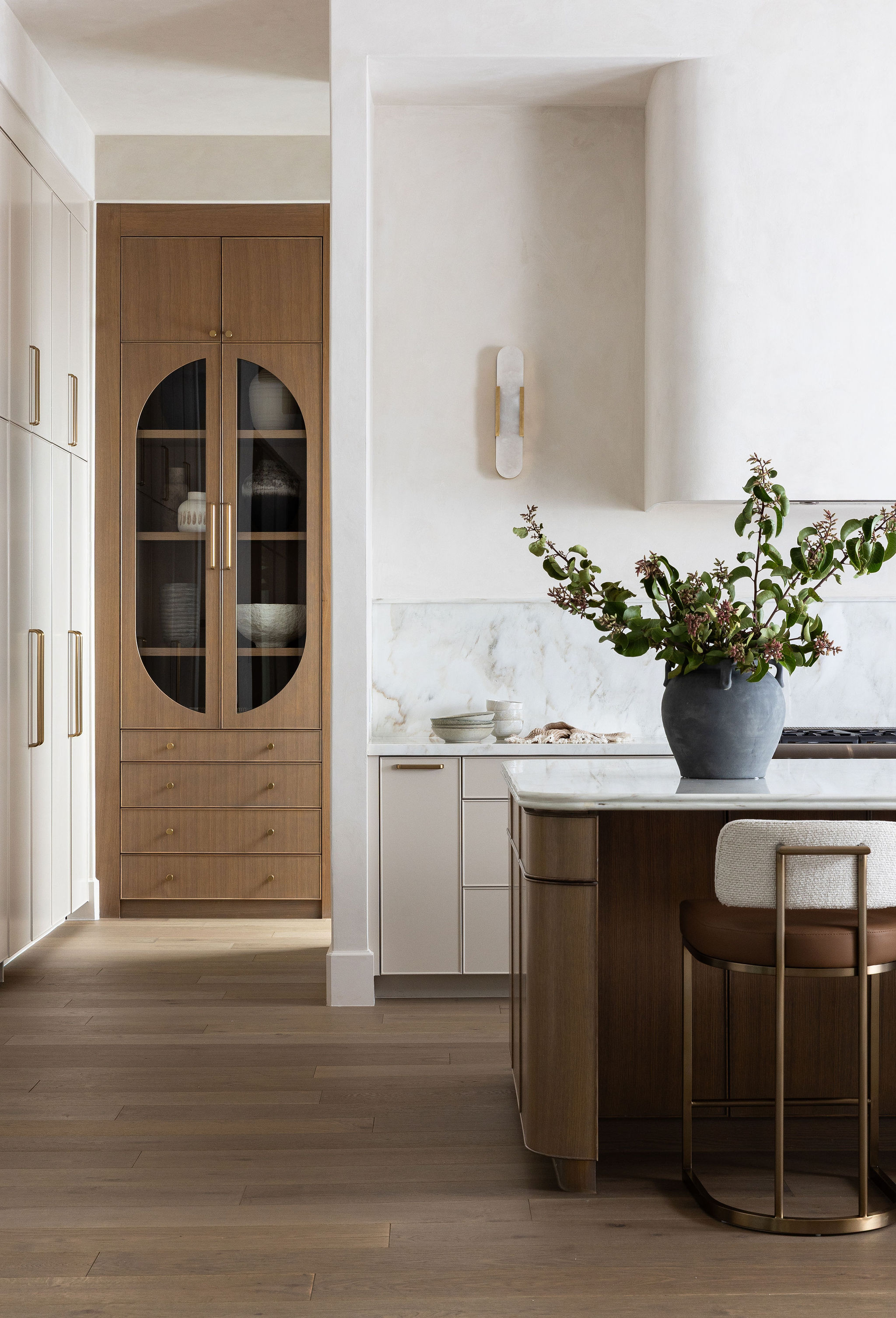 The design draws from the family's love of resort-style living and their travels to Mexico, resulting in a home that balances warmth with sophistication. Plaster walls and detailed ceilings run throughout the main living spaces. The primary bathroom opens through floor-to-ceiling glass sliders to a private outdoor cold plunge and hot tub. A moody home bar features custom millwork and dramatic stone countertops. The backyard is anchored by a sculptural tree sourced from Mexico and an outdoor dining space designed to feel like a private resort.