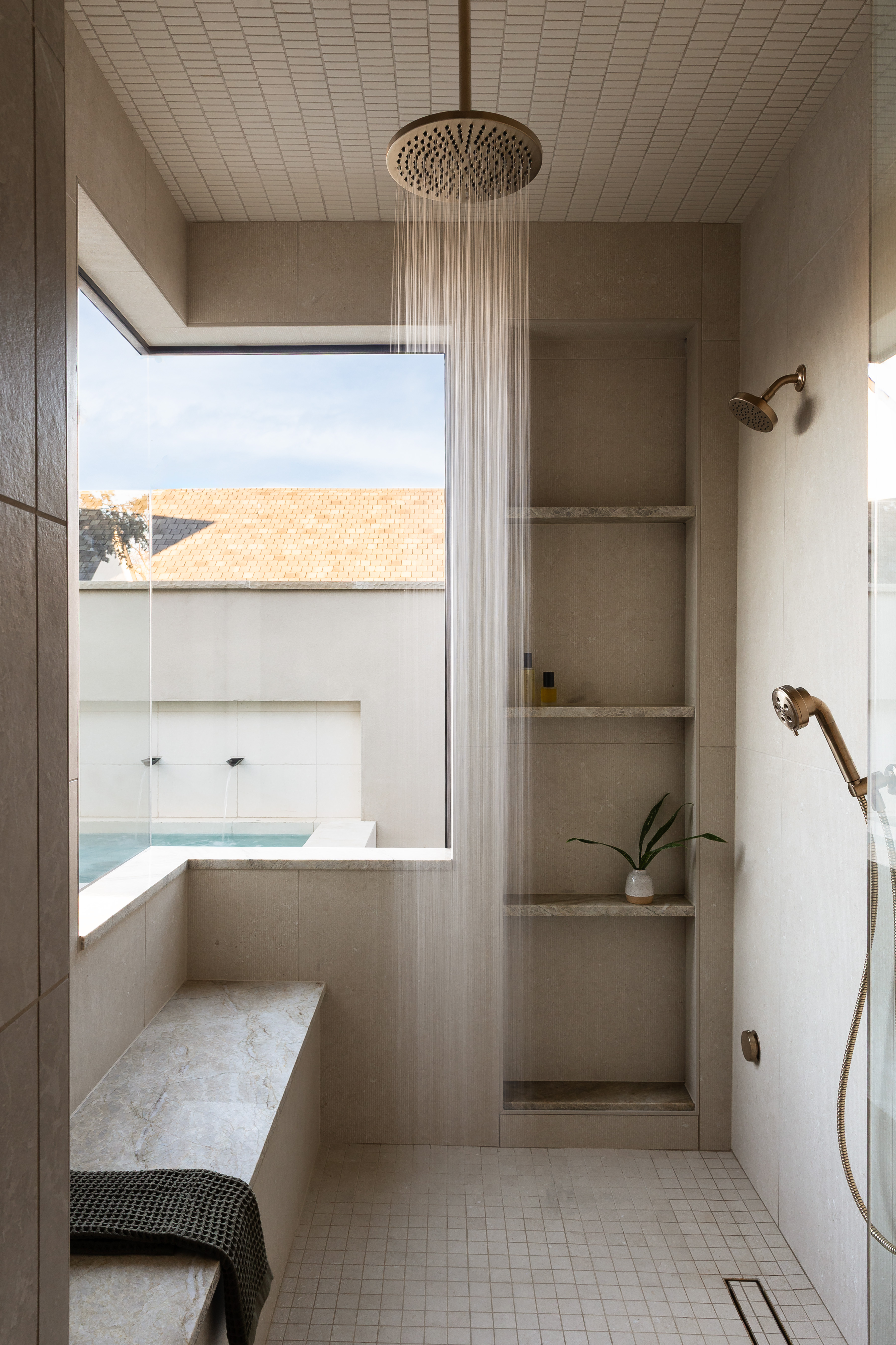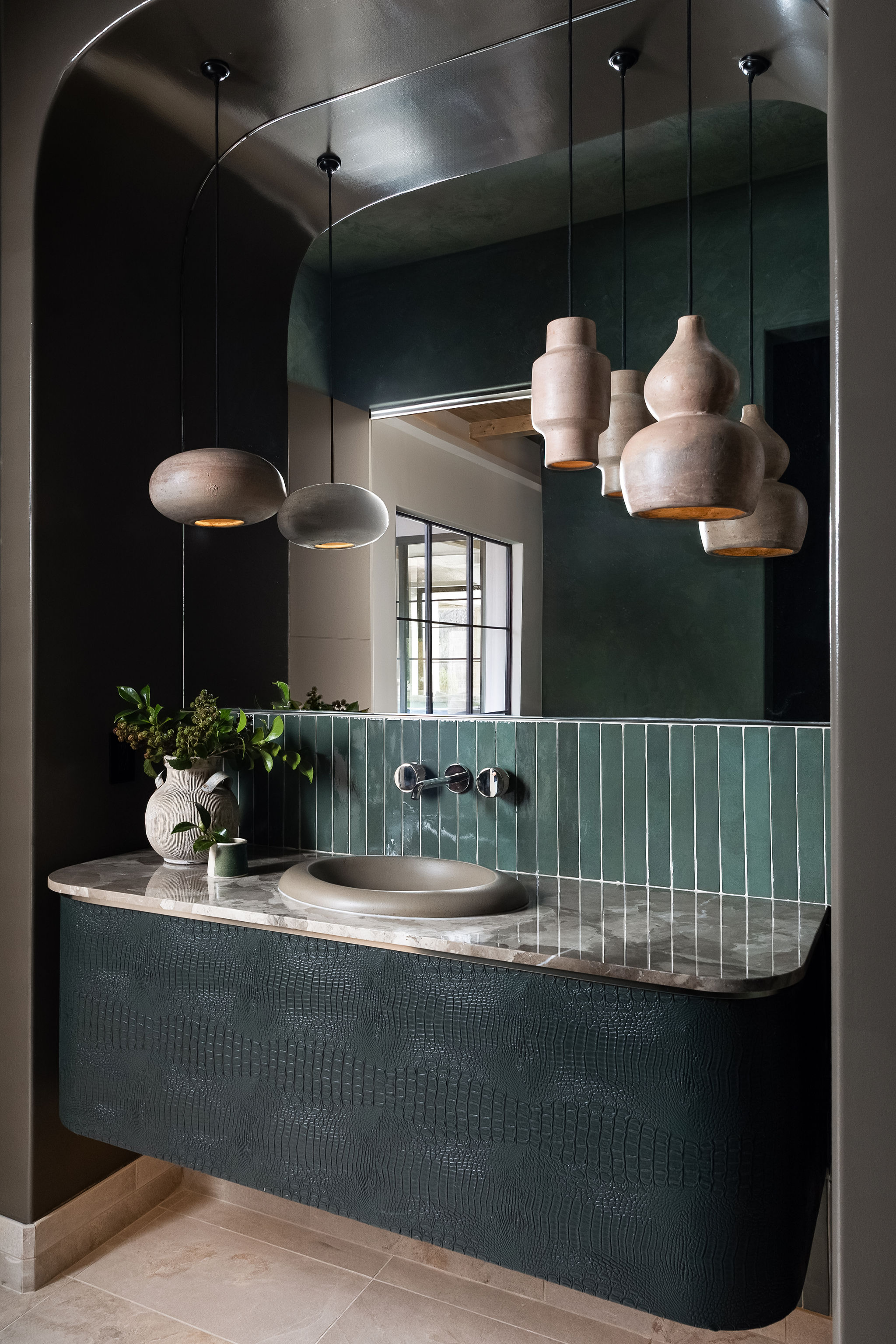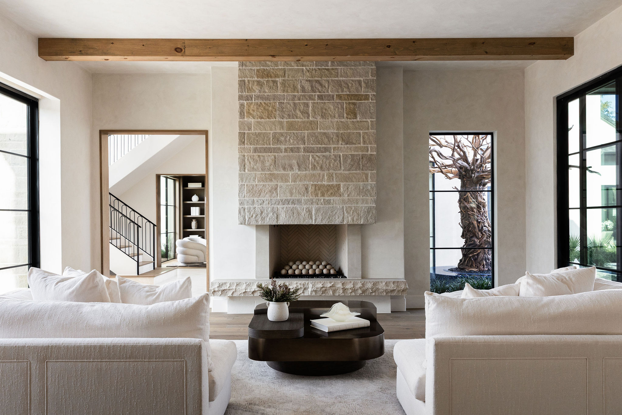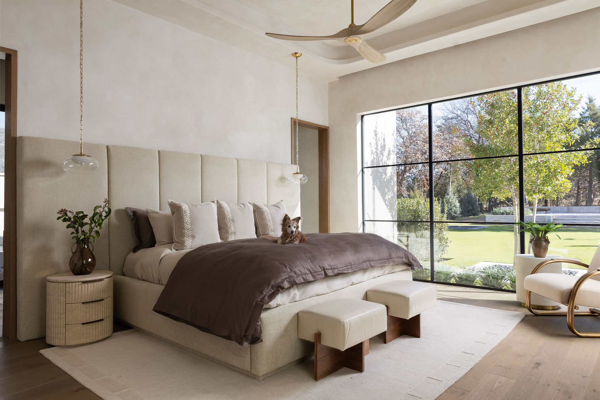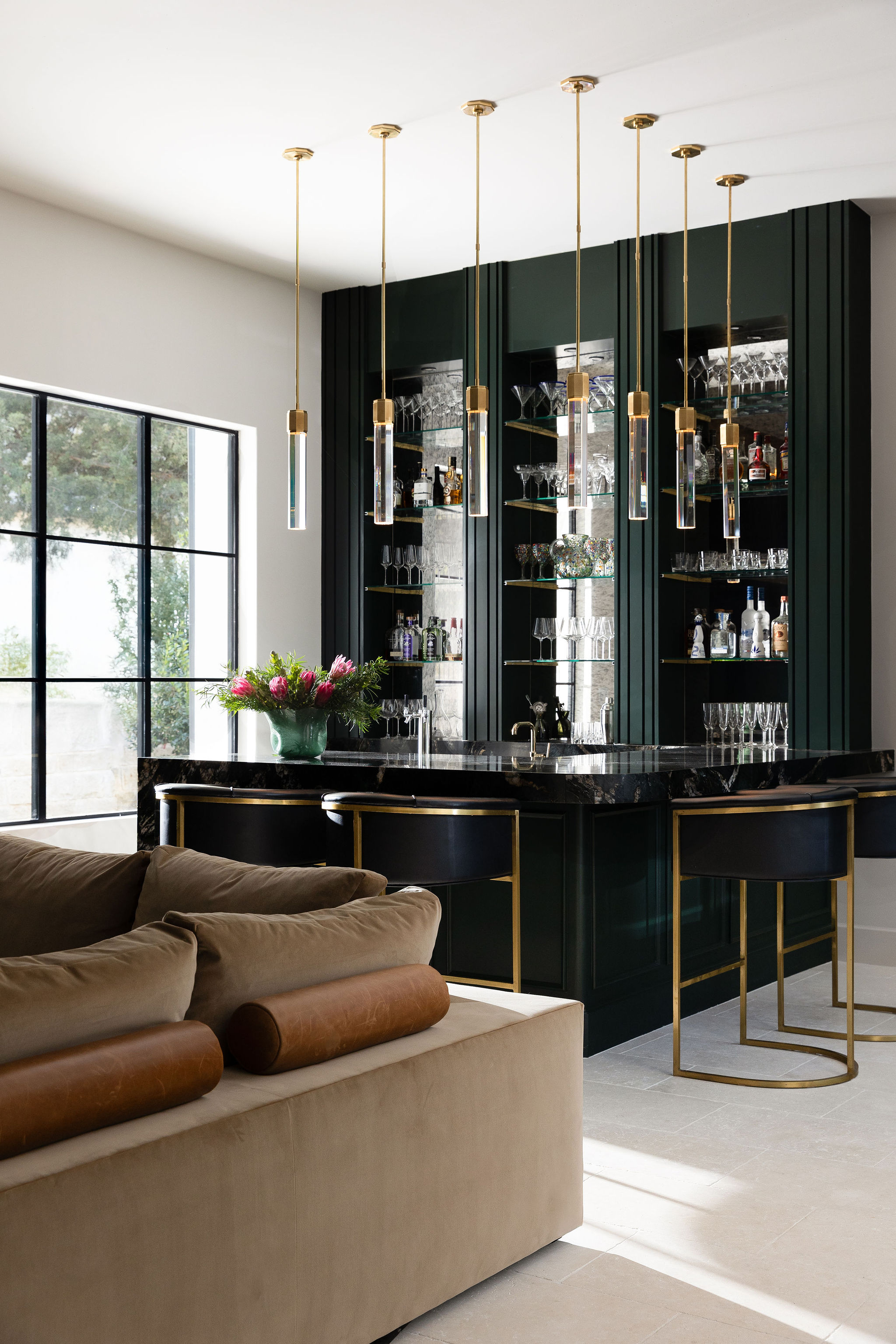 The design draws from the family's love of resort-style living and their travels to Mexico, resulting in a home that balances warmth with sophistication. Plaster walls and detailed ceilings run throughout the main living spaces. The primary bathroom opens through floor-to-ceiling glass sliders to a private outdoor cold plunge and hot tub. A moody home bar features custom millwork and dramatic stone countertops. The backyard is anchored by a sculptural tree sourced from Mexico and an outdoor dining space designed to feel like a private resort.