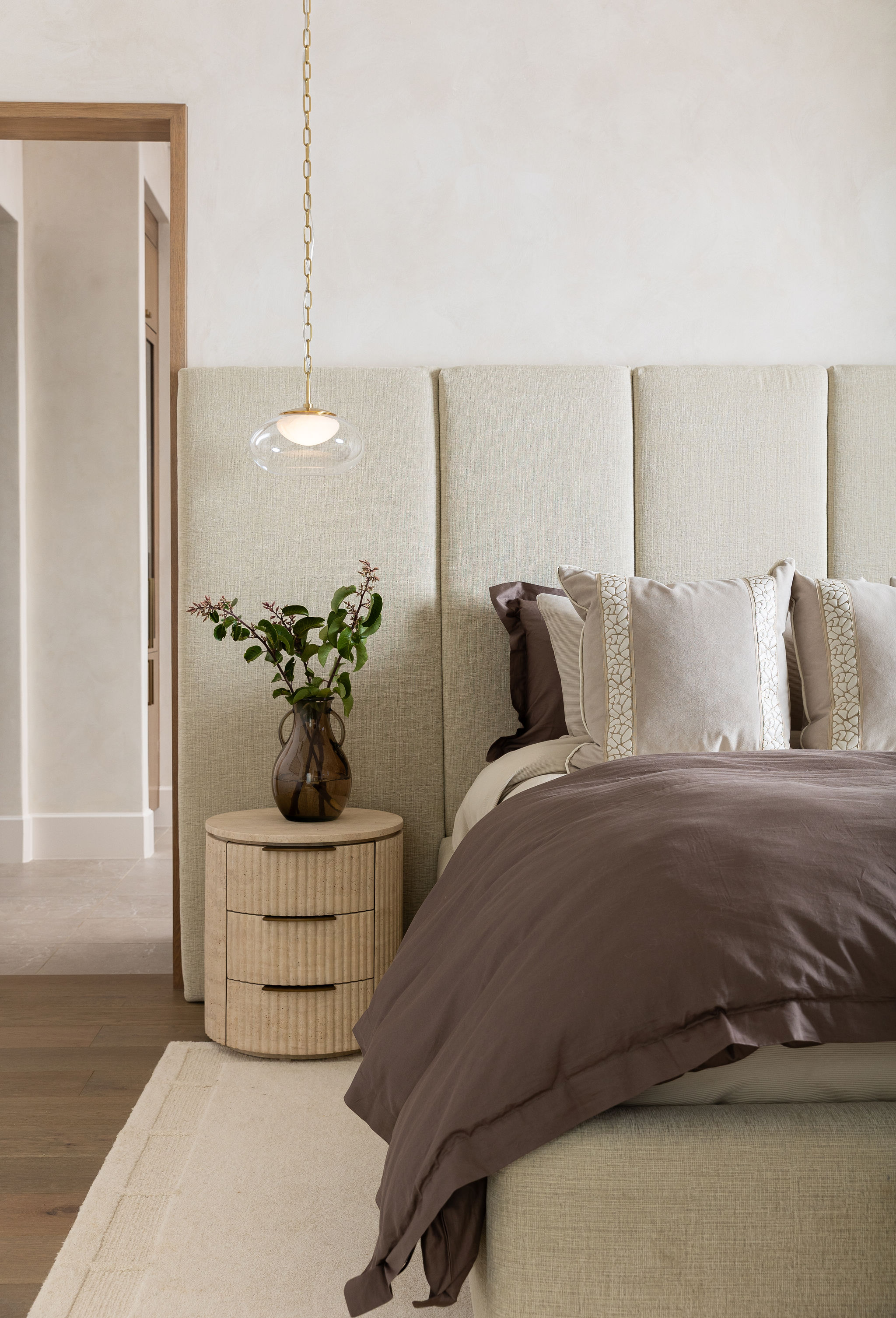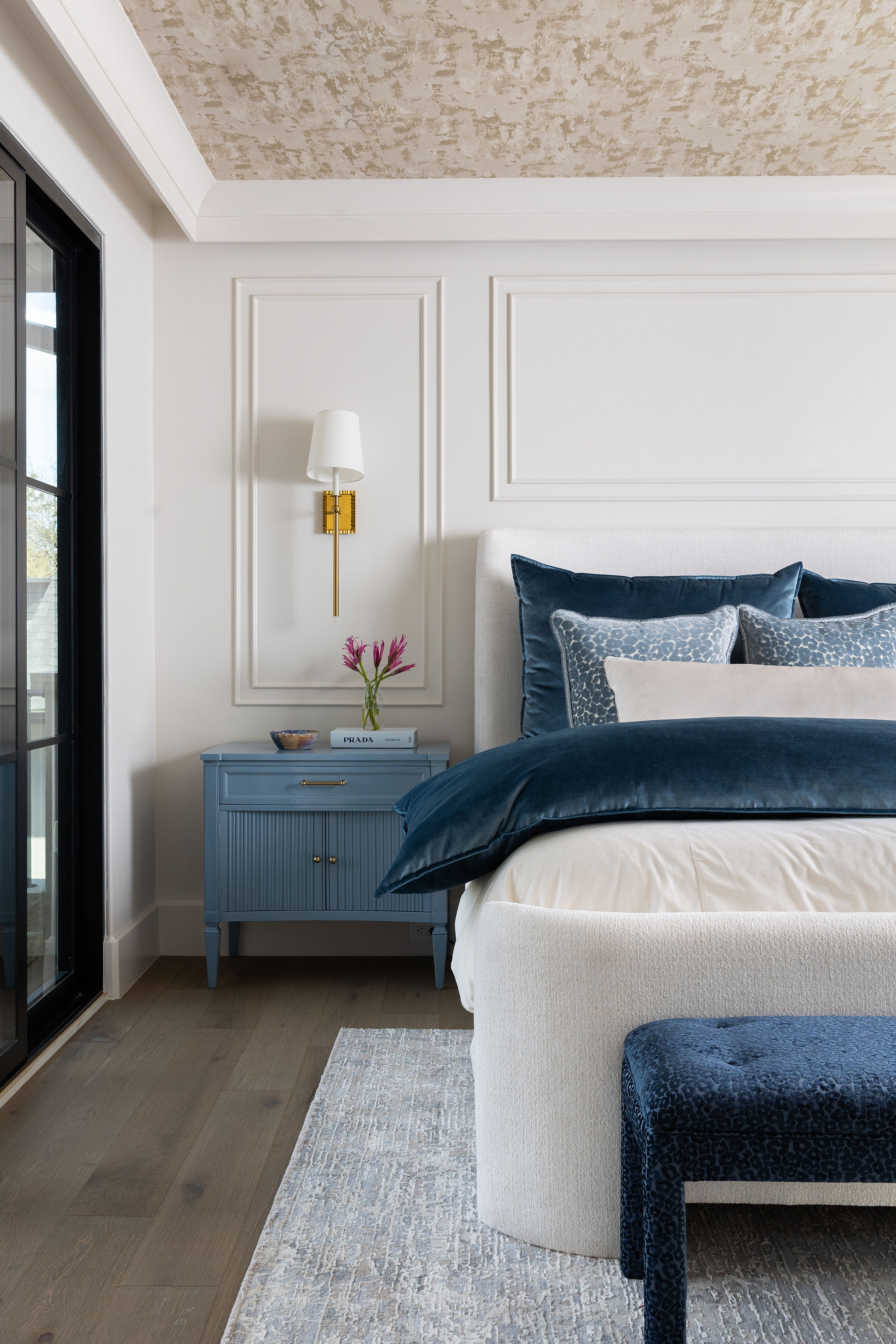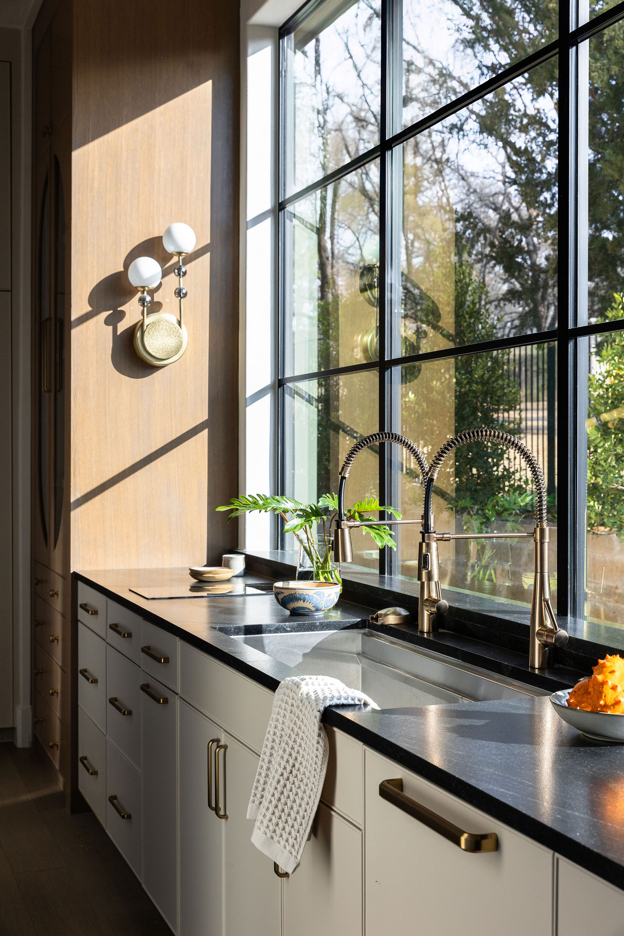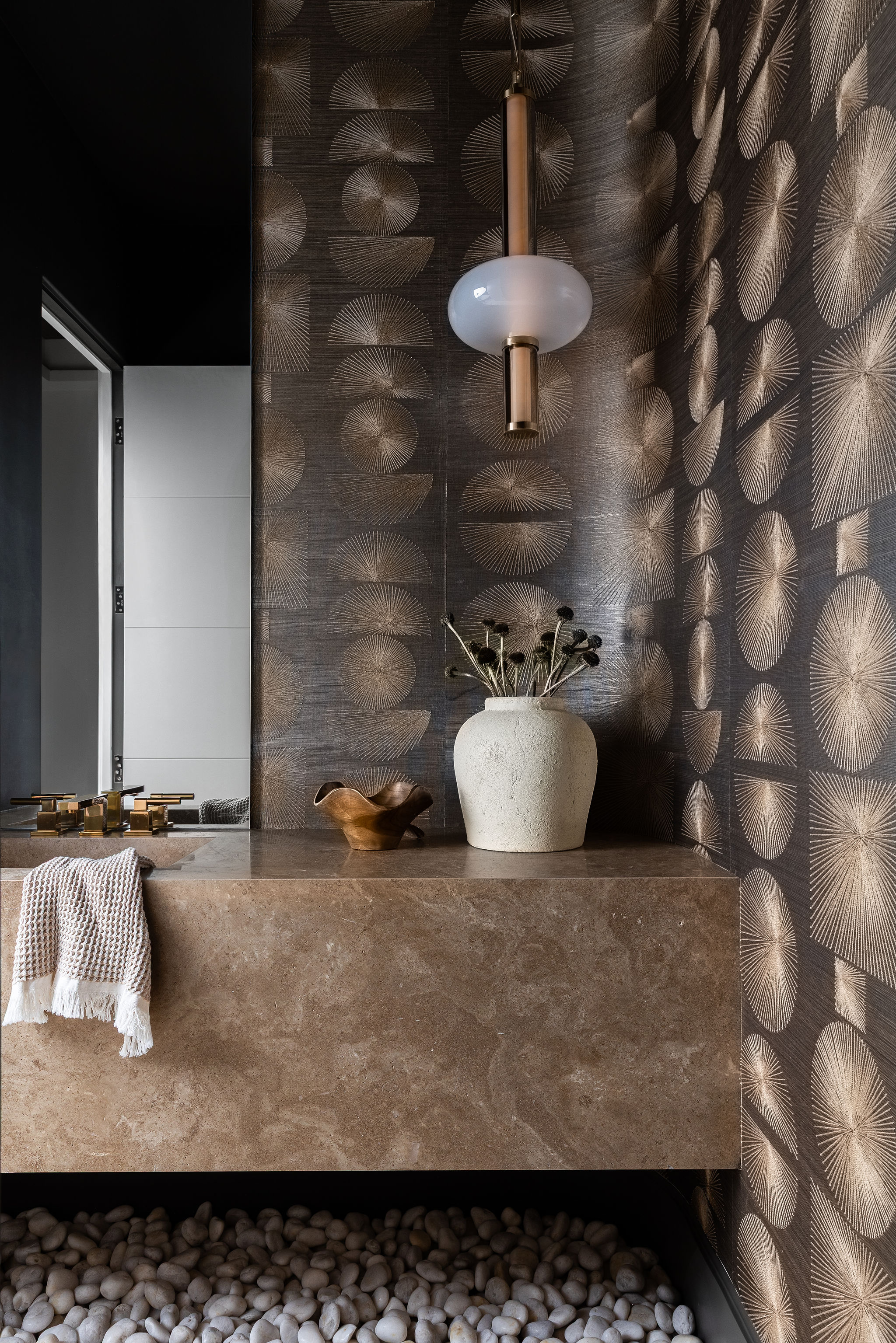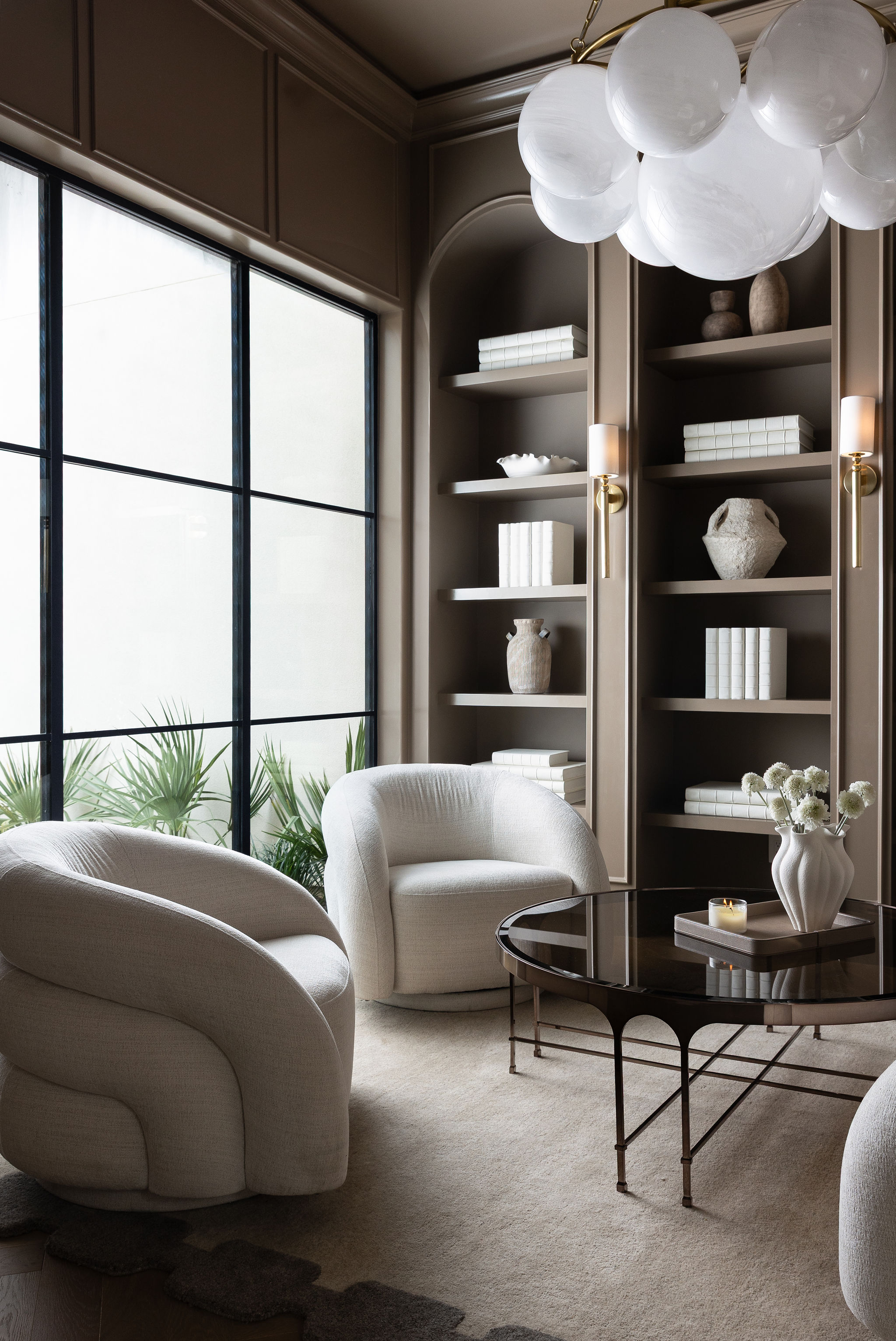 The design draws from the family's love of resort-style living and their travels to Mexico, resulting in a home that balances warmth with sophistication. Plaster walls and detailed ceilings run throughout the main living spaces. The primary bathroom opens through floor-to-ceiling glass sliders to a private outdoor cold plunge and hot tub. A moody home bar features custom millwork and dramatic stone countertops. The backyard is anchored by a sculptural tree sourced from Mexico and an outdoor dining space designed to feel like a private resort.