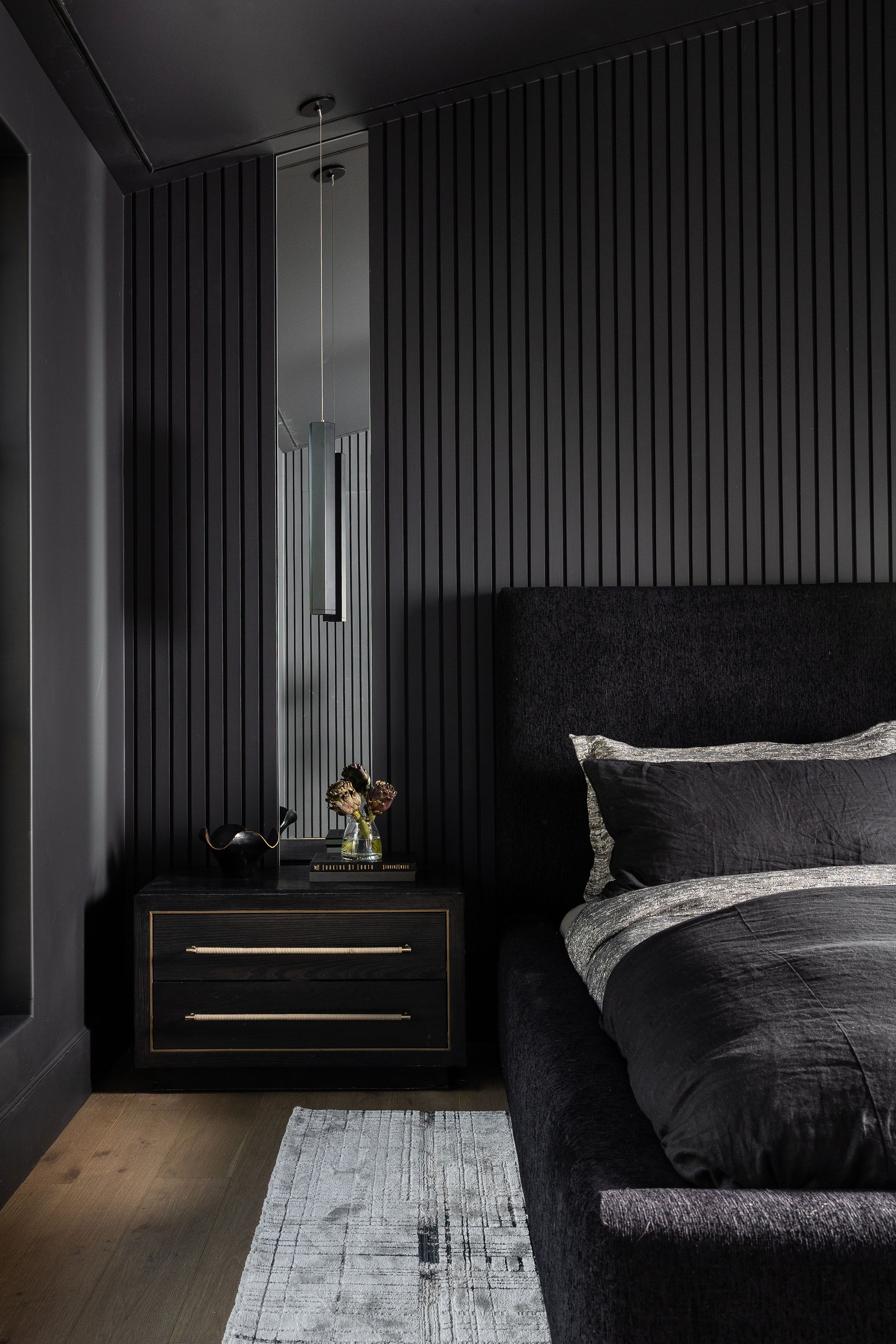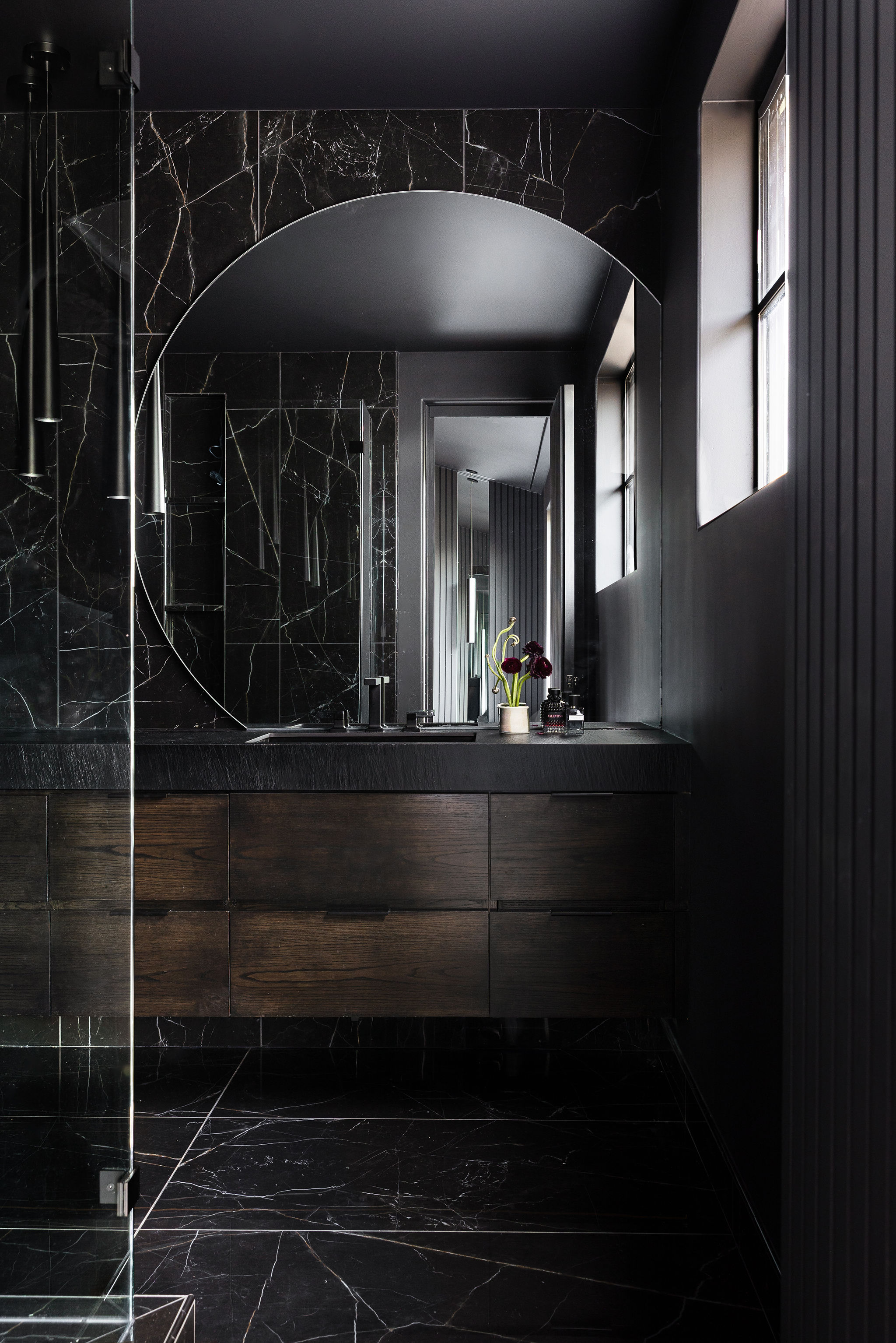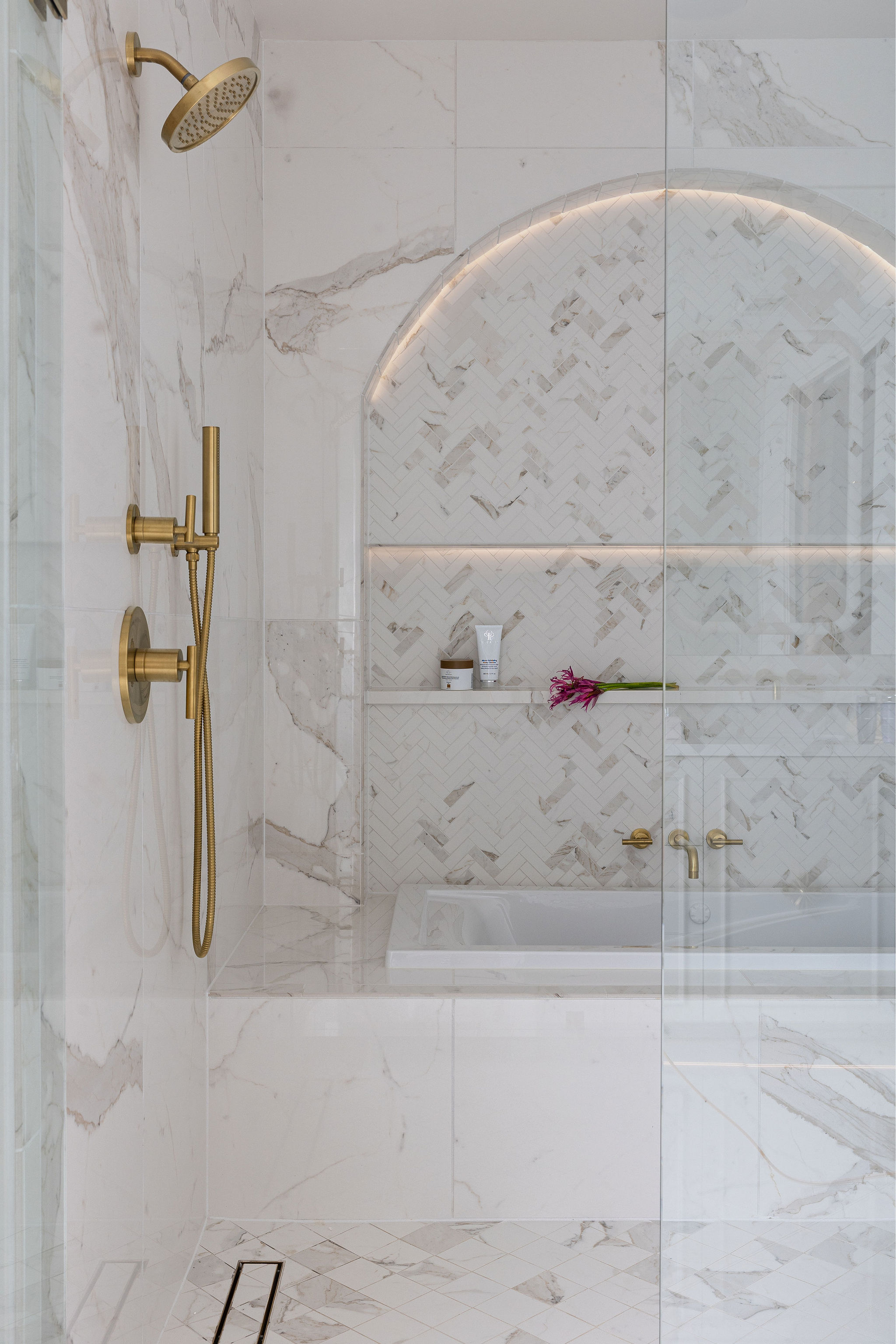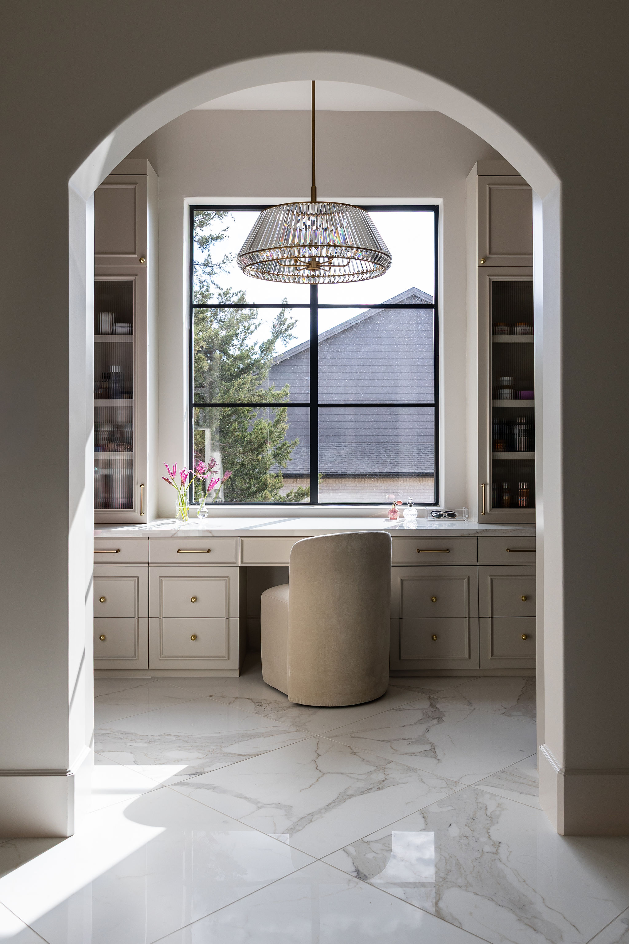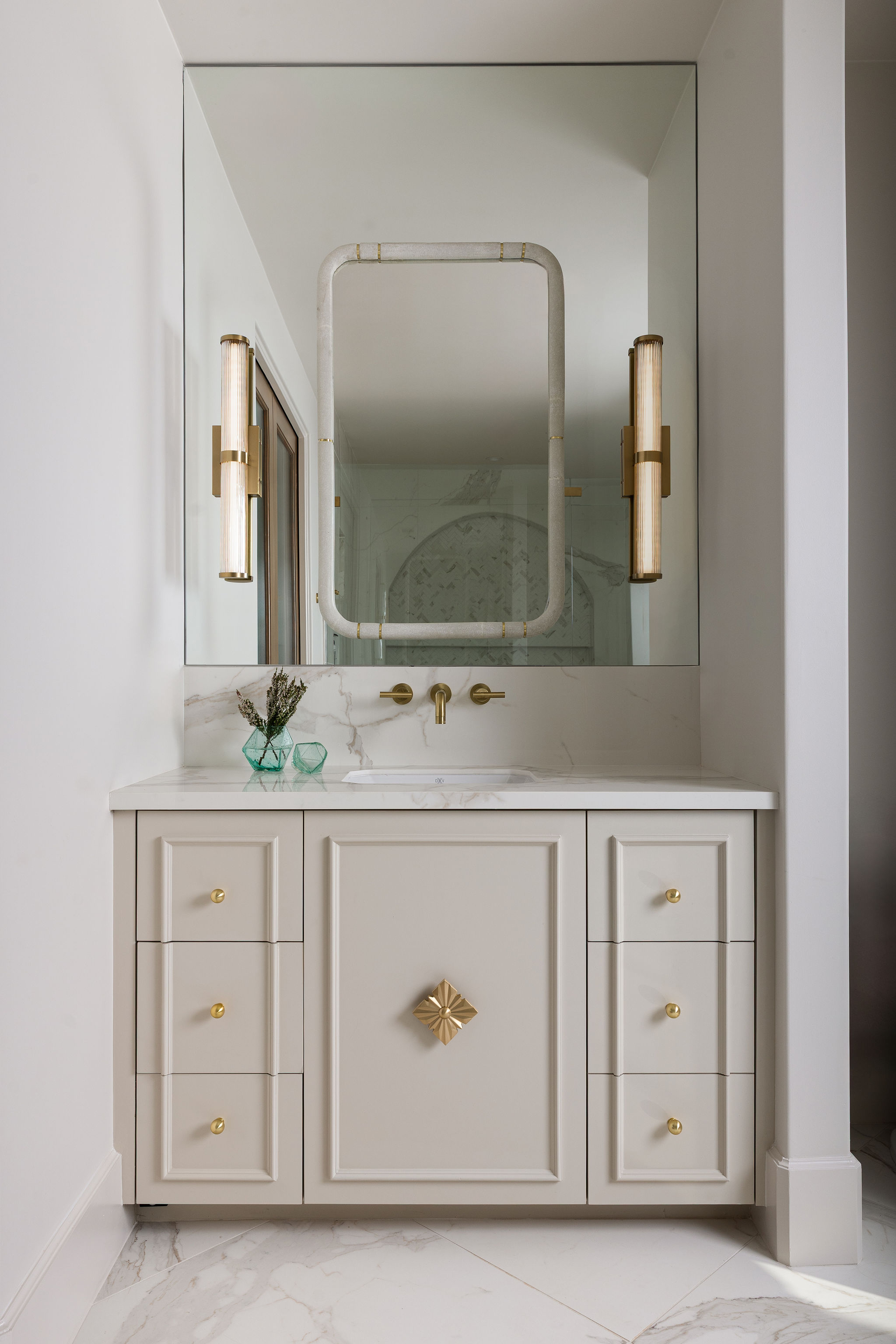 The design draws from the family's love of resort-style living and their travels to Mexico, resulting in a home that balances warmth with sophistication. Plaster walls and detailed ceilings run throughout the main living spaces. The primary bathroom opens through floor-to-ceiling glass sliders to a private outdoor cold plunge and hot tub. A moody home bar features custom millwork and dramatic stone countertops. The backyard is anchored by a sculptural tree sourced from Mexico and an outdoor dining space designed to feel like a private resort.